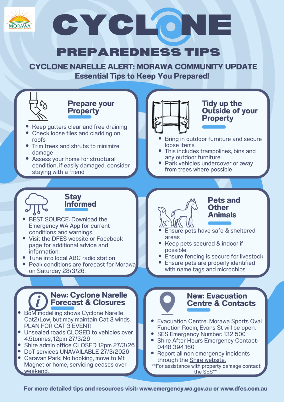 In the event of major damage caused to homes, the Morawa Sports Oval Function Room on Evans Street (football oval) will be opened as an evacuation centre.